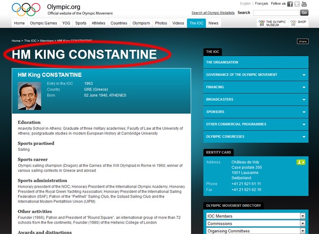 Την ίδια στιγμή η Ελληνική Ολυμπιακή Επιτροπή δεν έχει κάνει τίποτα για τον τίτλο του τέως βασιλιά Κωνσταντίνου Γλύξμπουργκ στο επίσημο σάιτ της Διεθνούς Ολυμπιακής Επιτροπής, έναν τίτλο που ουσιαστικά δεν υφίσταται αφού η βασιλεία έχει καταργηθεί στην Ελλάδα από το 1974 και μετά.