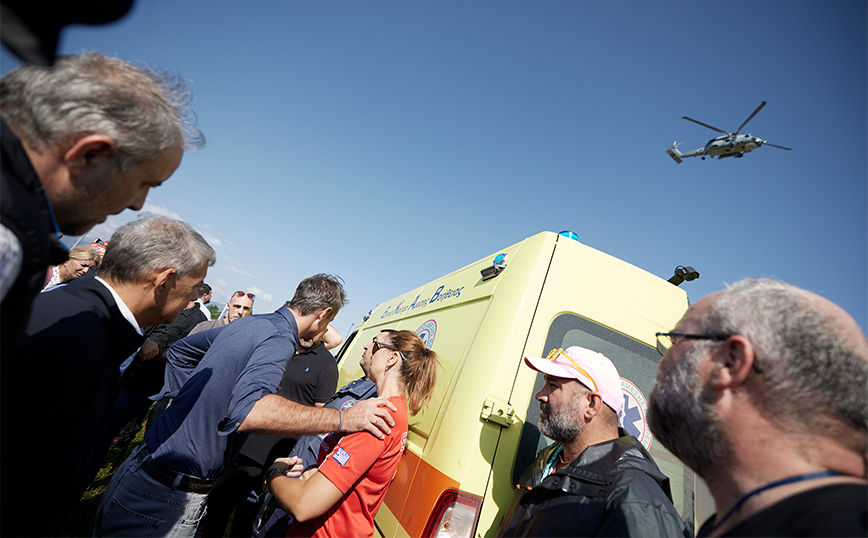 Νωρίτερα ο Πρωθυπουργός πέταξε πάνω από τις πληγείσες και προσγειώθηκε στο στάδιο της Καρδίτσας όπου μίλησε με τους απεγκλωβισθέντες που μετέφεραν εκείνη την ώρα τα ελικόπτερα, με τους διασώστες της πυροσβεστικής και του στρατού, τους πιλότους, το προσωπικό του ΕΚΑΒ, τους γιατρούς και τους νοσηλευτές.