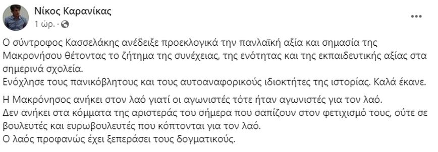 Ο λαός προφανώς έχει ξεπεράσει τους δογματικούς», έγραψε ο Νίκος Καρανίκας στον λογαριασμό του στο Facebook.