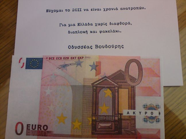 «Για μια Ελλάδα χωρίς διαφθορά, διαπλοκή και φακελάκι», γράφει η ευχετήρια κάρτα του Οδυσσέα Βουδούρη στους δημοσιογράφους, συνοδευόμενη όμως από ένα σφραγισμένο φακελάκι με ομοίωμα χαρτονομίσματος!