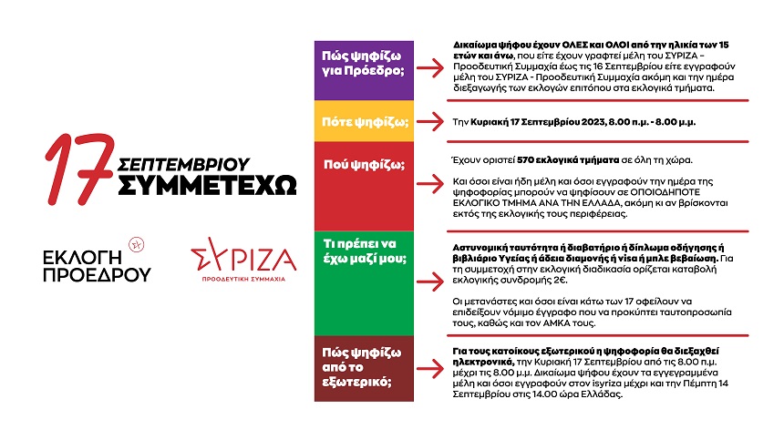 Για τους κατοίκους εξωτερικού η ψηφοφορία θα διεξαχθεί ηλεκτρονικά, την Κυριακή 17 Σεπτεμβρίου από τις 8.00 πμ μέχρι τις 8.00 μμ. Δικαίωμα ψήφου έχουν τα εγγεγραμμένα μέλη και όσοι εγγραφούν στον isyriza μέχρι και την Πέμπτη 14 Σεπτεμβρίου στις 14.00 ώρα Ελλάδας.