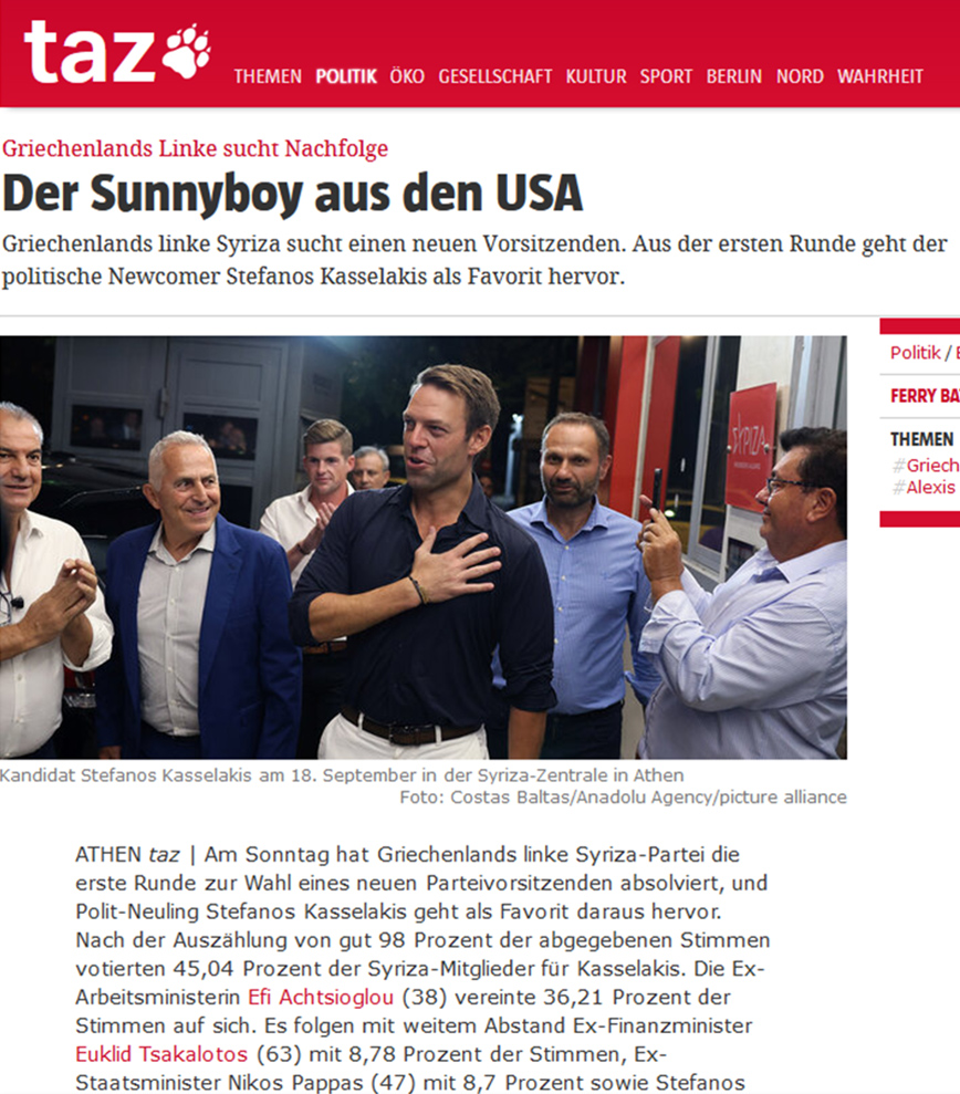 Την περασμένη Κυριακή, 17 Σεπτεμβρίου, γράφει η TAZ του Βερολίνου, ο Στέφανος Κασσελάκης πήρε ξεκάθαρο προβάδισμα στις εκλογές για την ανάδειξη του νέου αρχηγού του ΣΥΡΙΖΑ. Μετά την καταμέτρηση του 98% των ψήφων, το 45,04% των μελών του κόμματος ψήφισαν τον Κασσελάκη με την πρώην υπουργό Εργασίας, Έφη Αχτσιόγλου να λαμβάνει ποσοστό 36,2%. Ακολούθησαν με μεγάλη απόσταση ο πρώην υπουργός Οικονομικών, Ευκλείδης Τσακαλώτος με ποσοστό 8,78%, ο πρώην υπουργός Επικρατείας, Νίκος Παππάς με 8,7% και ο Στέφανος Τζουμάκας με 1,29%. Οι εκλογές ήταν απαραίτητες, αφού ο προηγούμενος αρχηγός του κόμματος Αλέξης Τσίπρας ανακοίνωσε την παραίτησή του μετά την κακή απόδοση του ΣΥΡΙΖΑ στις βουλευτικές εκλογές που διεξήχθησαν στην Ελλάδα τέλος Ιουνίου. Οι πρώτες αντιδράσεις από τη νίκη Κασσελάκη στον πρώτο γύρο των εκλογών δείχνουν μία σκληρή πολιτική αντιπαράθεση, αναφέρει η γερμανική εφημερίδα.