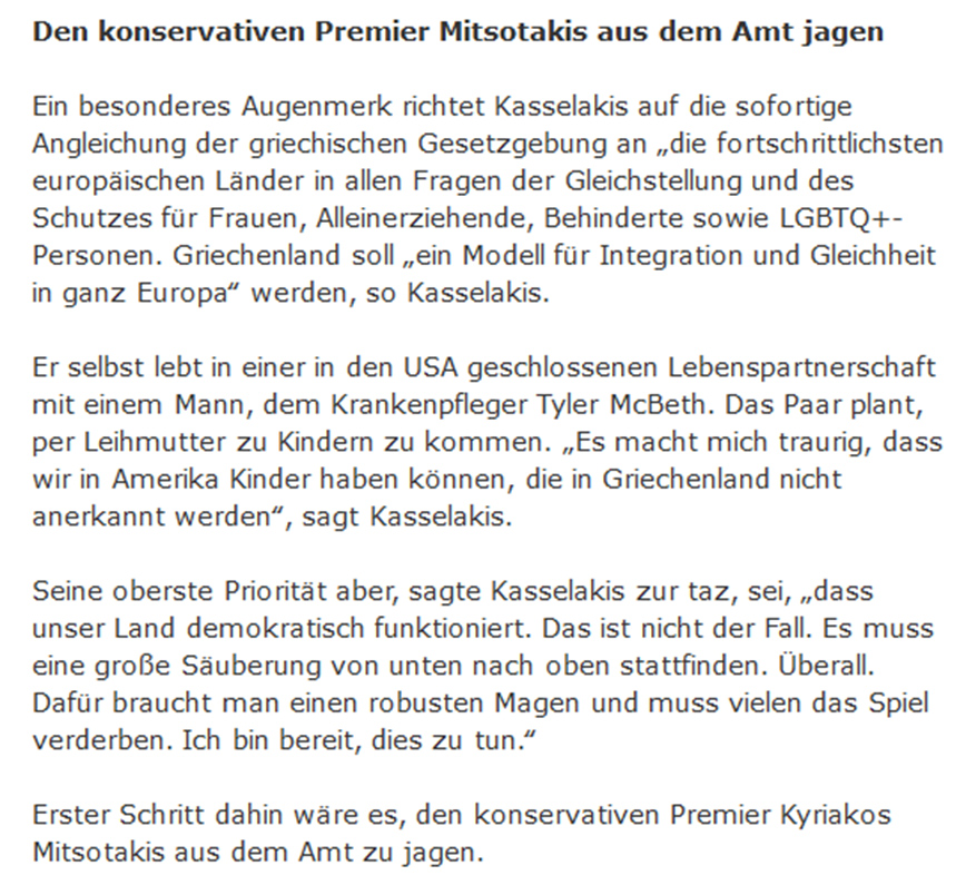 Δημοσίευμα της γερμανικής εφημερίδας ΤΑΖ αναφέρει ότι ο Στέφανος Κασσελάκης «σχεδιάζει να αποκτήσει παιδί μέσω παρένθετης μητέρας με τον σύντροφό του», τον Tyler McBeth. Το άρθρο του γερμανικού εντύπου στον 35χρονο υποψήφιο πρόεδρο του ΣΥΡΙΖΑ έχει τίτλο «το ηλιοκαμένο αγόρι από τις ΗΠΑ». Σε συνέντευξή του στην εφημερίδα του Βερολίνου, ο Στέφανος Κασσελάκης δήλωσε, μεταξύ άλλων, ότι σχεδιάζει να αποκτήσει παιδί με τον σύντροφό του, μέσω παρένθετης μητέρας. «Με στενοχωρεί που μπορούμε να κάνουμε παιδιά στην Αμερική που δεν αναγνωρίζονται στην Ελλάδα» ανέφερε ο υποψήφιος για την Προεδρία του ΣΥΡΙΖΑ.