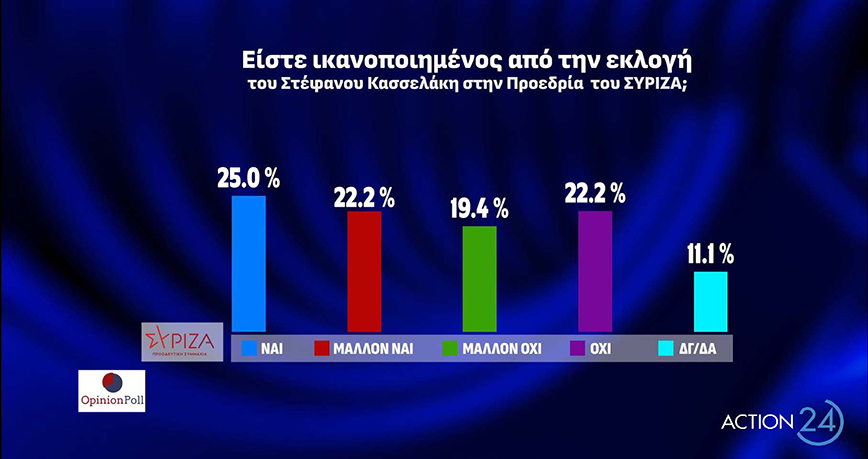Σε ερώτηση «είστε ικανοποιημένος με την εκλογή Κασσελάκη;» το 25% απάντησε θετικά, το 22,2% μάλλον ναι, το 19,4% μάλλον όχι, και το 22,2% απάντησε αρνητικά.