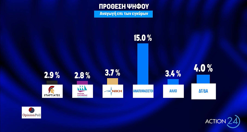 Το πολιτικό βαρόμετρο και το πώς αυτό έχει διαμορφωθεί μετά και την εκλογή του Στέφανου Κασσελάκη στην ηγεσία του ΣΥΡΙΖΑ παρουσίασε το ACTION 24 στο κεντρικό δελτίο ειδήσεων. Στην πρώτη πανελλαδική δημοσκόπηση της OPINION POLL μετά την εκλογή του Στέφανου Κασσελάκη οι πολίτες κλήθηκαν να απαντήσουν σχετικά με το ποιο θεωρούν το πιο σοβαρό πρόβλημα για τη χώρα και πόσο ικανοποιημένοι είναι από το συνολικό έργο της Κυβέρνησης μέχρι σήμερα και πόσο για τα αντανακλαστικά που έδειξε για τις καταστροφές και για τα μέτρα στήριξης των πληγέντων;