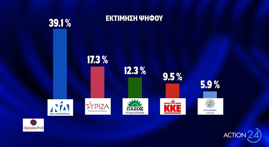 Σε ό,τι αφορά τέλος την πρόθεση ψήφου, η Νέα Δημοκρατία συγκεντρώνει ποσοστό 39,1%, ο ΣΥΡΙΖΑ 17,3%, το ΠΑΣΟΚ 12,3%, το ΚΚΕ 8,7%, η Ελληνική Λύση 4,0%, οι Σπαρτιάτες 3,6%, η Πλεύση Ελευθερίας 3,4% και η Νίκη 4,6%.