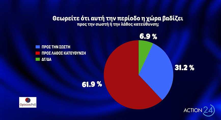 Θεωρούν ότι αυτή την περίοδο η χώρα βαδίζει προς την σωστή κατεύθυνση; Το 61,9% απάντησε πως βαδίζει προς την λάθος ενώ το 31,2% προς την σωστή.