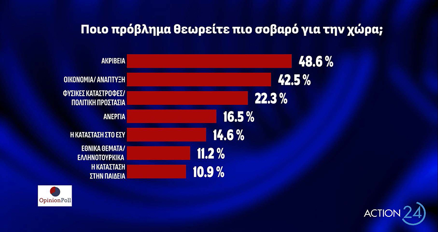 Στην ερώτηση ποιο πρόβλημα θεωρούν πιο σοβαρό για τη χώρα σε ποσοστό 48,6% απάντησαν την ακρίβεια ενώ στη δεύτερη θέση ακολουθεί με ποσοστό 42,5% η οικονομία.