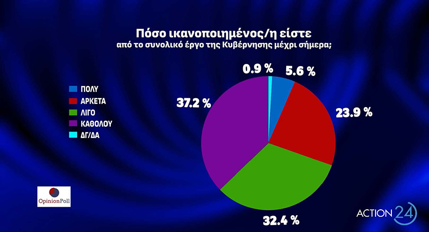 Σε ερώτηση «πόσο ικανοποιημένοι είστε από το συνολικό έργο της κυβέρνησης μέχρι σήμερα;» το 37,2% απάντησε καθόλου ενώ το 32,4% λίγο.