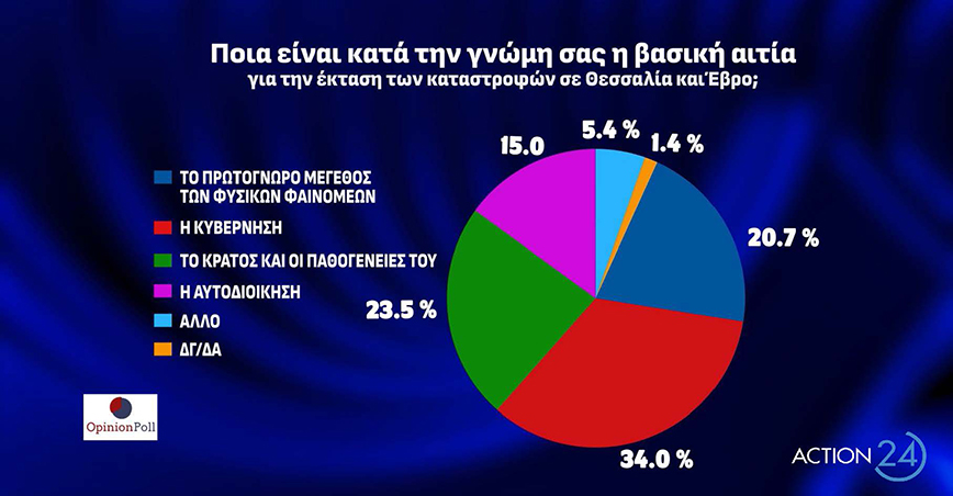 Σε ότι αφορά τις καταστροφές στον Έβρο και τη Θεσσαλία, σε ποσοστό 34% πιστεύουν πως ευθύνεται η κυβέρνηση.