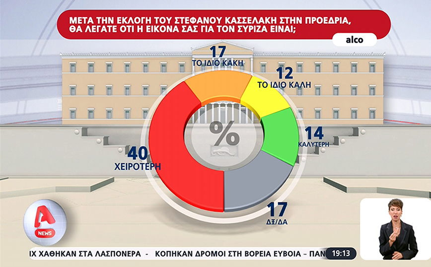 Διαφορά 17% μεταξύ ΝΔ και ΣΥΡΙΖΑ καταγράφει η δημοσκόπηση της Alco για την τηλεόραση του Alpha, λίγες ημέρες μετά την εκλογή του Στέφανου Κασσελάκη στην ηγεσία του ΣΥΡΙΖΑ.