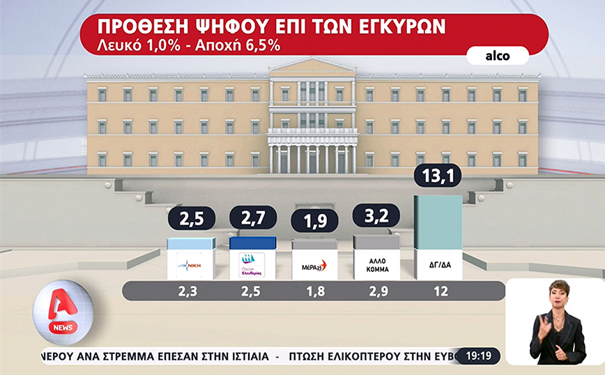 Συγκεκριμένα, η ΝΔ λαμβάνει 32,3%, ο ΣΥΡΙΖΑ 15,3%, το ΠΑΣΟK 11,8%, ενώ η Ελληνική Λύση παίρνει 5%, οι Σπαρτιάτες 4,5%. Τέλος, το ΚΚΕ στηρίζει το 7,7%, ενώ η Νίκη λαμβάνει 2,5% και η Πλεύση Ελευθερίας το 2,7%.
