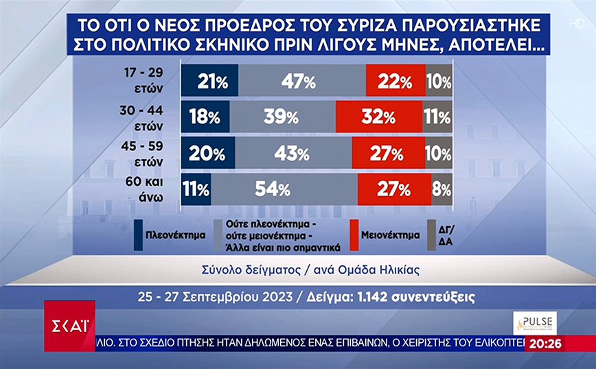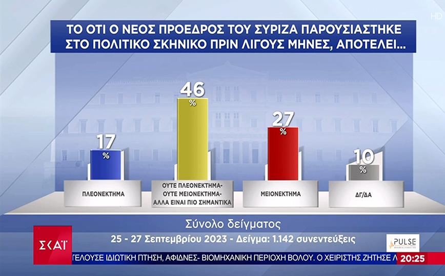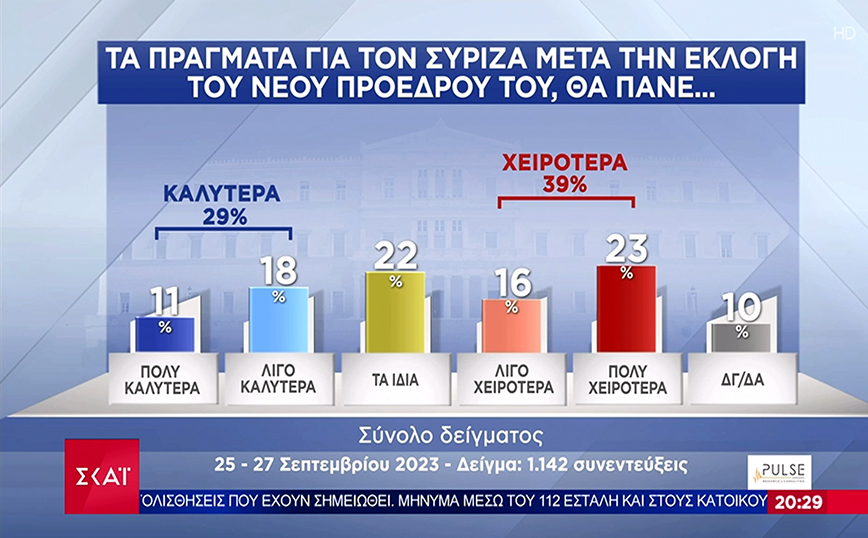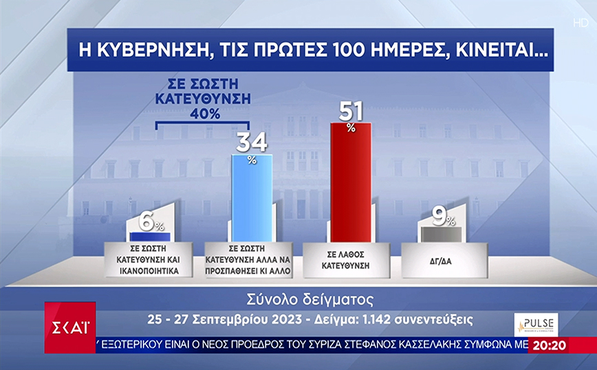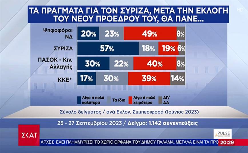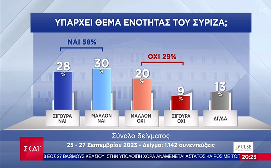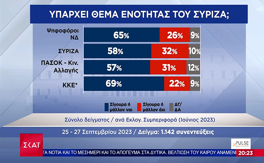 Zήτημα ενότητας στον ΣΥΡΙΖΑ θεωρούν ότι υπάρχει μετά την εκλογή Κασσελάκη στην ηγεσία του κόμματος, περίπου 6 στους 10 πολίτες (58%), όπως προκύπτει από τη μεγάλη δημοσκόπηση της Pulse για τον Σκάι.