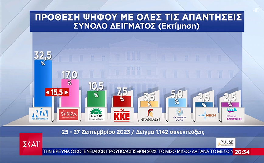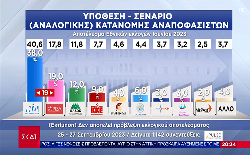 Έτσι, στην πρόθεση ψήφου ο ΣΥΡΙΖΑ λαμβάνει 17% έναντι 32,5% της ΝΔ (διαφορά 15,5 ποσοστιαίες μονάδες), ενώ στο σενάριο της αναλογικής κατανομής των αναποφάσιστων η ΝΔ λαμβάνει 38% έναντι 19% του ΣΥΡΙΖΑ- στο σενάριο αυτό η διαφορά ανάμεσα στα δύο κόμματα φτάνει τις 19 ποσοστιαίες μονάδες.