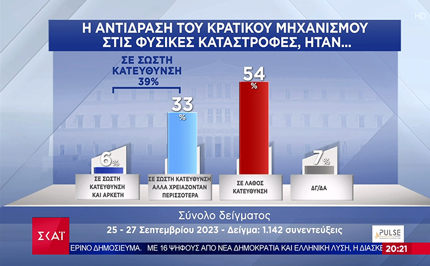 Συγκεκριμένα, η ΝΔ λαμβάνει το 29,7%, ο ΣΥΡΙΖΑ 13,7%, το ΠΑΣΟK 10,2%, ενώ η Ελληνική Λύση παίρνει 6,1%, οι Σπαρτιάτες 3,1%. Τέλος, το ΚΚΕ στηρίζει το 7,7%, ενώ η Νίκη λαμβάνει 3,6 % και η Πλεύση Ελευθερίας το 2,6 %.