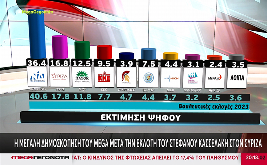 Συγκεκριμένα, η ΝΔ λαμβάνει 32,3%, ο ΣΥΡΙΖΑ 15,3%, το ΠΑΣΟK 11,8%, ενώ η Ελληνική Λύση παίρνει 5%, οι Σπαρτιάτες 4,5%. Τέλος, το ΚΚΕ στηρίζει το 7,7%, ενώ η Νίκη λαμβάνει 2,5% και η Πλεύση Ελευθερίας το 2,7%.