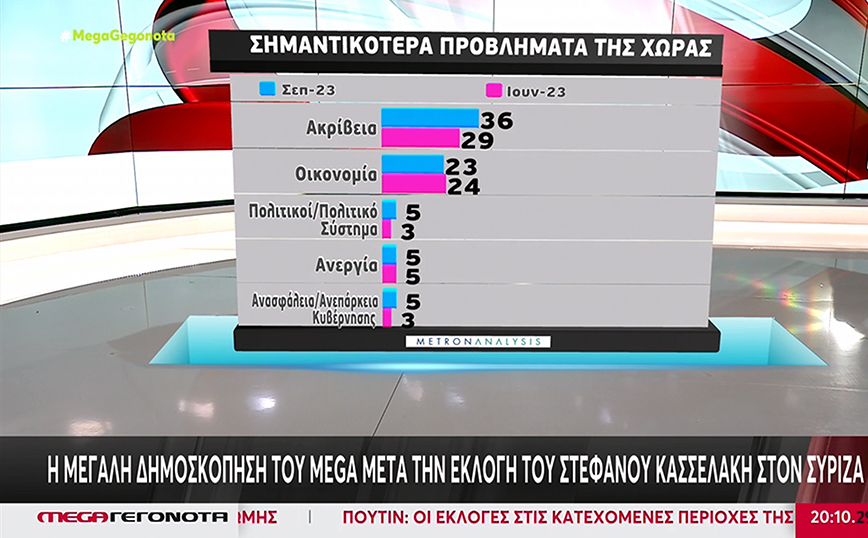 Διαφορά 16% μεταξύ ΝΔ και ΣΥΡΙΖΑ καταγράφει η δημοσκόπηση της Metron Analysis για την τηλεόραση του Mega, λίγες ημέρες μετά την εκλογή του Στέφανου Κασσελάκη στην ηγεσία του ΣΥΡΙΖΑ.