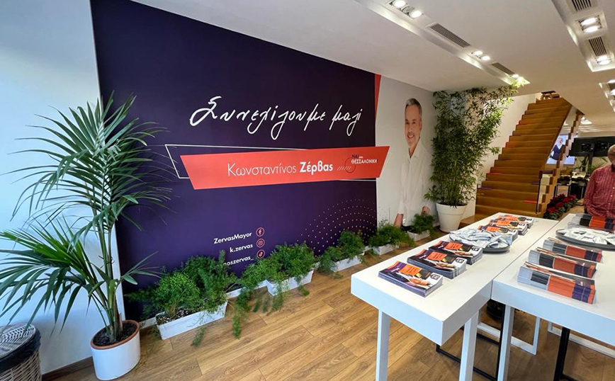 Εντός του εκλογικού κέντρου, που βρίσκεται στην περιοχή του Ιερού Ναού Αγίας Σοφίας, και ειδικότερα στην οδό Μακένζυ Κινγλ 8 υπάρχει άφθονο έντυπο προεκλογικό υλικό με το πρόγραμμα, τις θέσεις του κ. Ζέρβα καθώς και το έργο που έχει επιτελέσει, ενώ όλη η διακόσμηση είναι σε μίνιμαλ ύφος, με αναπαυτικούς καναπέδες και λειτουργικά γραφεία, φυτά εσωτερικού χώρου και ντυμένους με πίνακες και γραφιστικά του δημοτικού συνδυασμού τοίχους.