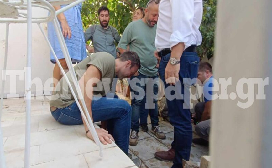 Ο κ. Κασσελάκης μάλιστα κάθισε στο πρεβάζι και έβγαλε τα παπούτσια του και πραγματοποίησε αυτοψία στο πλημμυρισμένο ακίνητο.