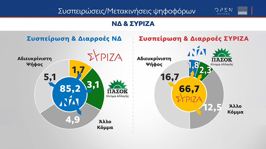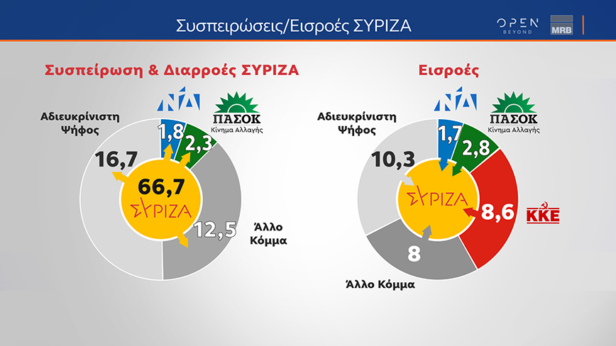 Στον ΣΥΡΙΖΑ, πάλι, παρότι βλέπουμε να διατηρεί σταθερό το ποσοστό του, παρουσιάζει χαμηλή συσπείρωση, με ποσοστό 66.7%. Το κόμμα τις αξιωματικής αντιπολίτευσης δίνει διαρροές προς άλλα κόμματα, με ένα 12.5% των ψηφοφόρων του να δηλώνει ότι θα ψηφίσει άλλο κόμμα, την ίδια στιγμή, όμως, και οι εισροές του έχουν ενδιαφέρον, καθώς, όπως φαίνεται, ο ΣΥΡΙΖΑ χάνει αλλά και παίρνει περίπου τα ίδια, και αυτό σημαίνει μία ανακατάταξη στη δομή του κόμματος.