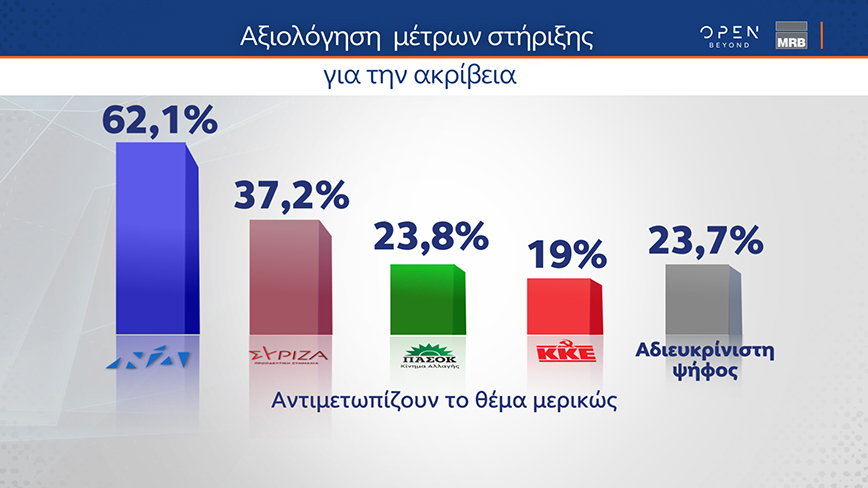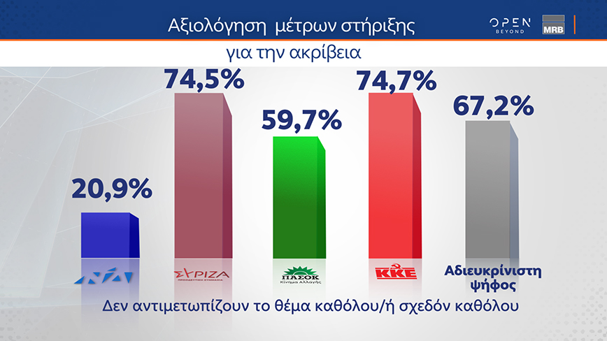 Στην ίδια δημοσκόπηση παρουσιάστηκε η δημοτικότητα του Στέφανου Κασσελάκη σε διάφορες κατηγορίες πολιτών, αλλά και η αξιολόγηση των πολιτών για τα οικονομικά μέτρα της κυβέρνησης.