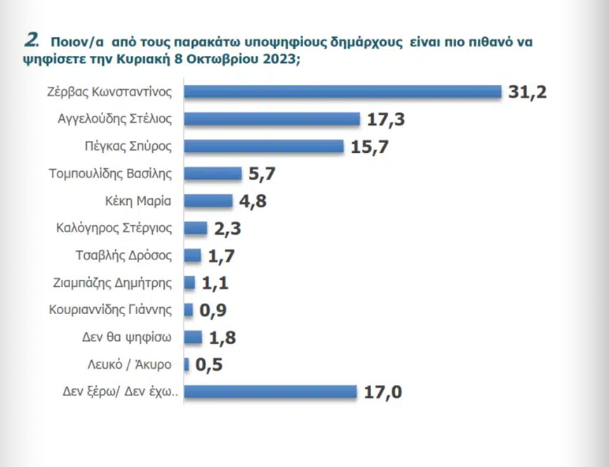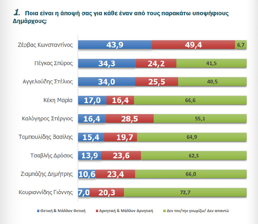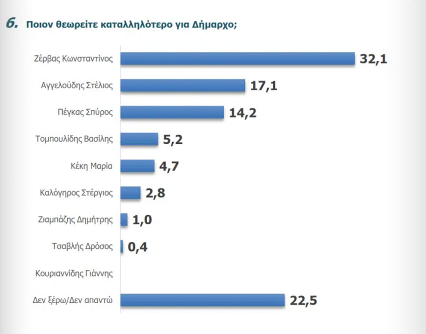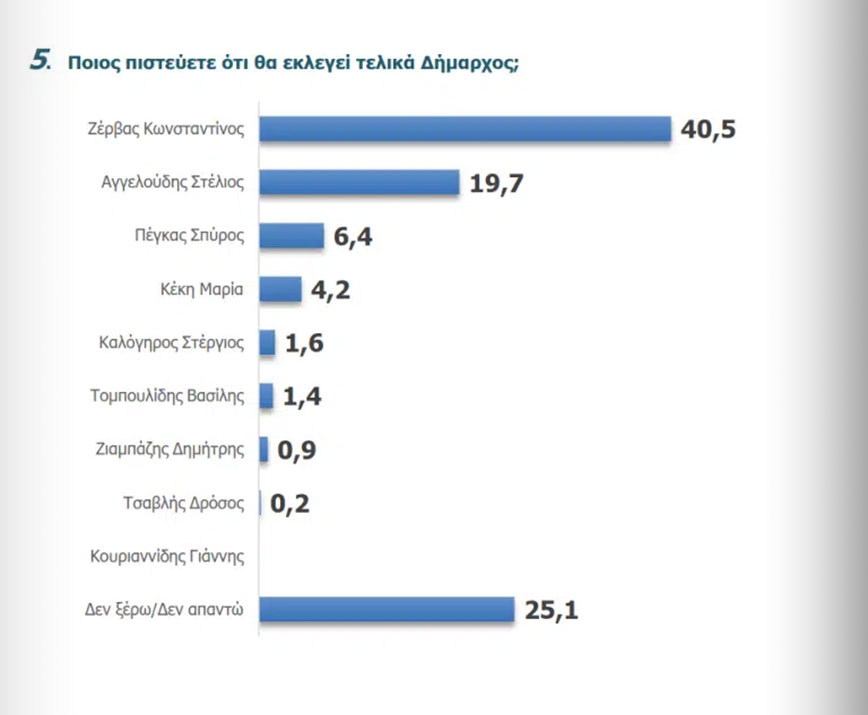 Στην “παράσταση νίκης” δηλαδή στην ερώτηση «ποιός πιστεύετε πως θα εκλεγεί δήμαρχος, ο κ. Ζέρβας συγκεντρώνει 40.5% έναντι 19.5% του κ. Αγγελούδη και 6.4% του κ. Πέγκα. Στην δε “καταλληλότητα” στην ερώτηση, δηλαδή “ποιον θεωρείτε καταλληλότερο για δήμαρχο», το 32.1% απαντά τον νυν δήμαρχο κ. Ζέρβα, τον κ. Αγγελούδη το 17.1% και τον κ. Πέγκα το 14.2%.