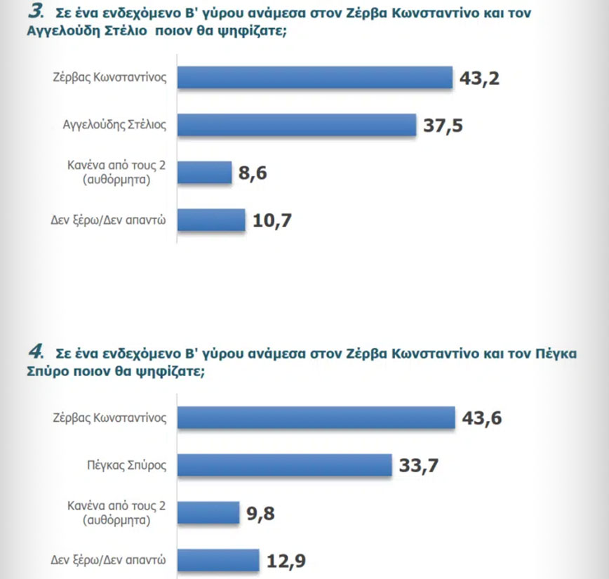 Στον δεύτερο γύρο ο κ. Ζέρβας φαίνεται να επικρατεί και απέναντι στον κ. Αγγελούδη και στον κ. Πέγκα. Στην πρώτη περίπτωση ο κ. Ζέρβας συγκεντρώνει 43.2% και ο κ. Αγγελούδης 37.5% και στην δεύτερη ο κ. Ζέρβας συγκεντρώνει 43.6% και ο κ. Πέγκας 33.7%.
