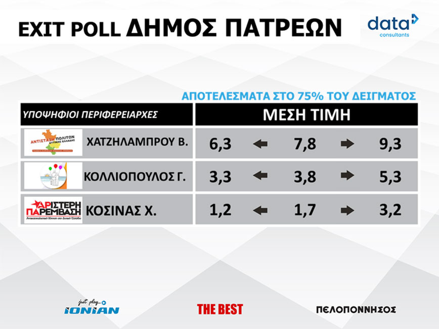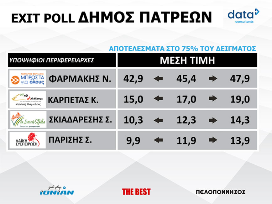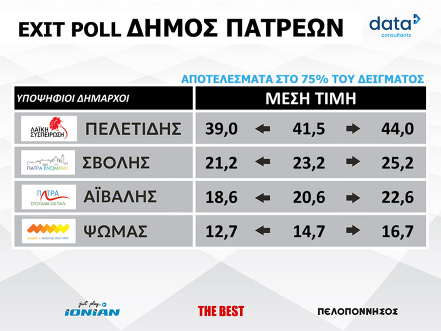 «Καθαρή» πρωτιά Πελετίδη στον Δήμο της Πάτρας με ανοιχτό το ενδεχόμενο να εκλεγεί ακόμα και από την πρώτη Κυριακή αλλά και εκλογή Φαρμάκη στην Περιφέρεια Δυτικής Ελλάδας, δείχνει το exit poll που πραγματοποιήθηκε για λογαριασμό του Ionian, του The Best και της εφημερίδας Πελοπόννησος.
