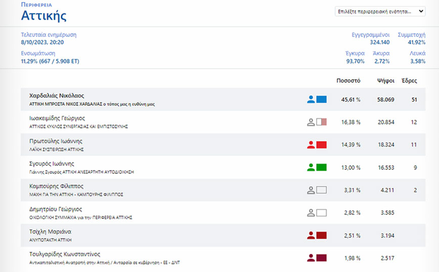 Σημαντικό προβάδισμα και εκλογή του Νίκου Χαρδαλιά από τον πρώτο γύρο των αυτοδιοικητικών εκλογών δείχνουν τα μέχρι στιγμής αποτελέσματα. Συγκεκριμένα, με την εσνωμάτωση στο 11,29%, ο κ. Χαρδαλιάς συγκεντρώνει 45,61%.