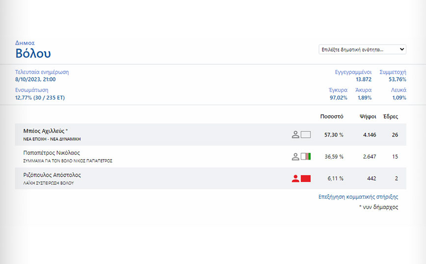Με την ενσωμάτωση στο 12,77%, ο νυν δήμαρχος Βόλου, Αχιλλέας Μπέος, προηγείται για τον δήμο με 57,30%.