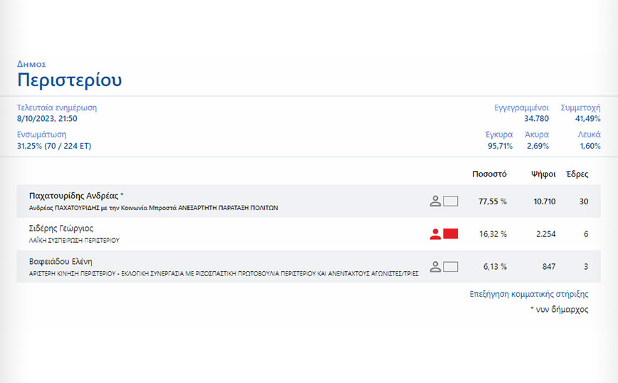 Προς την έκτη επανεκλογή του στο δήμο Περιστερίου οδεύει ολοταχώς ο Ανδρέας Παχατουρίδης, καθώς με την ενσωμάτωση πάνω από το 30% συγκεντρώνει το 77,55% των ψήφων.