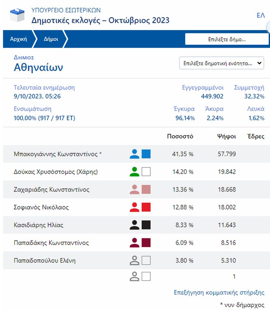 Με την ενσωμάτωση στο 100% στον δήμο Αθηναίων, ο νυν δήμαρχος Κώστας Μπακογιάννης συγκεντρώνει ποσοστό 41,35%, ενώ ο Χάρης Δούκας ακολουθεί δεύτερος με 14,20%.