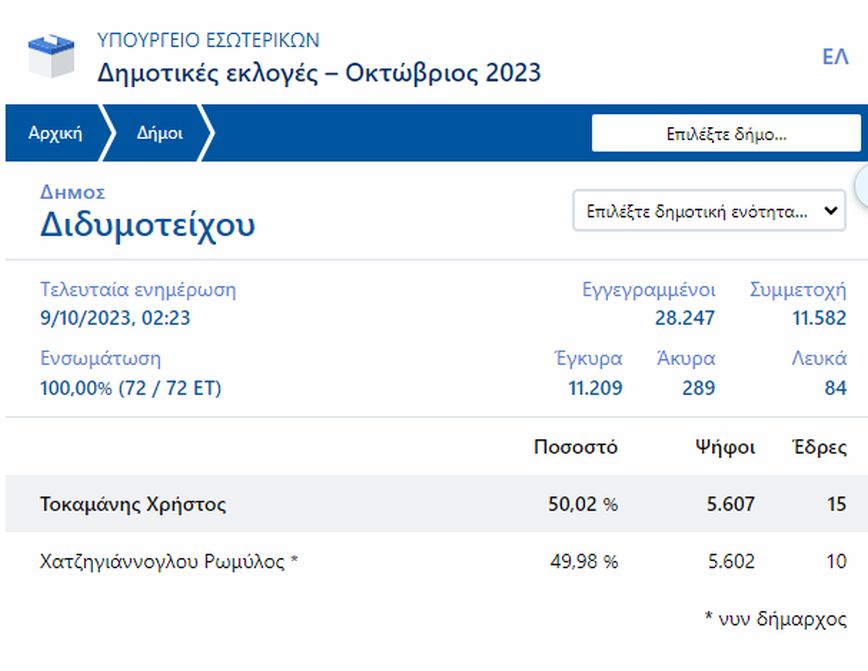 Με την ενσωμάτωση να έχει φτάσει στο 100% ο δήμος φαίνεται πως περνάει στα χέρια του Χρήστου Τοκαμάνη με μόλις 5 ψήφους διάφορα! Ο νικητής έλαβε 5.607 ψήφους και ο αντίπαλός του 5.602.