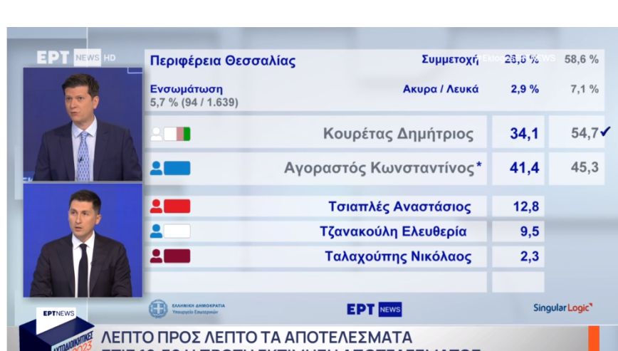 Με την ενσωμάτωση στο 5,7%, ο Δημήτρης Κουρέτας φαίνεται να προηγείται του Κώστα Αγοραστού στην περιφέρεια Θεσσαλίας, στη δεύτερη Κυριακή των αυτοδιοικητικών εκλογών.