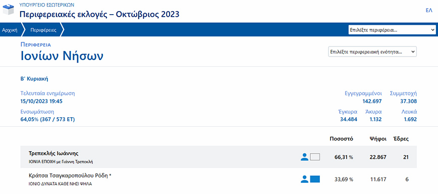 Με την ενσωμάτωση στο 54,97%, στη μάχη της Περιφέρειας Ιονίων Νήσων ανάμεσα στον Ιωάννη Τρεπεκλή και τη Ρόδη Κράτσα Τσαγκαροπούλου, φαίνεται πως νικητής βγαίνει ο κ. Τρεπεκλής με ποσοστό 66,11%.