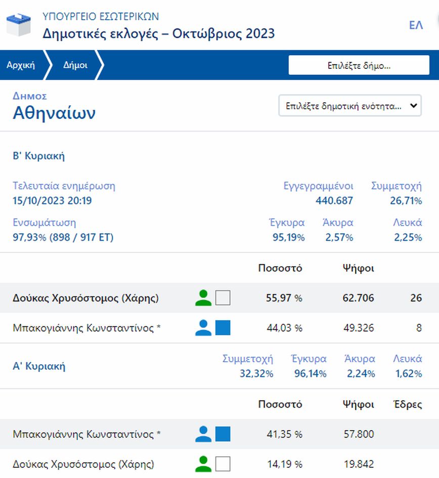 Η ενσωμάτωση έχει φτάσει στο 97,93% στον δήμο της Αθήνας και τα ποσοστά των δύο υποψηφίων στον δεύτερο γύρο των αυτοδιοικητικών εκλογών διαμορφώνονται ως εξής: