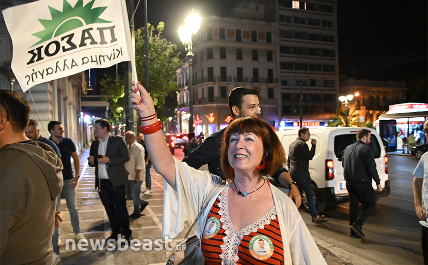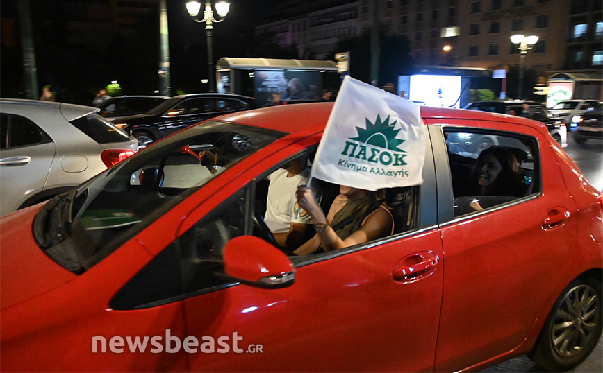 Μετά τους πανηγυρισμούς στο εκλογικό γραφείο του Χάρη Δούκα, υποστηρικτές του βγήκαν τους δρόμους της Αθήνας, με τις χαρακτηριστικές σημαίες που απεικονίζουν τον πράσινο ήλιο του ΠΑΣΟΚ.