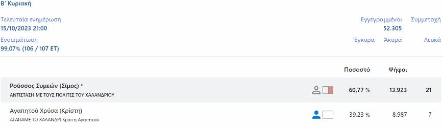 Αντιθέτως, η ανθυποψήφια του Αγαπητού Χρύσα με το «Αγαπάμε Χαλάνδρι» έλαβε ποσοστό 39,23%.