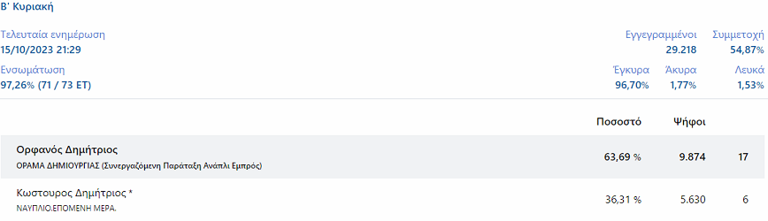 Ωστόσο, στο δεύτερο γύρο πήρε 36,31%, με τον Δημήτρη Ορφανό να παίρνει 63,69%.