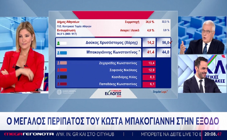 «Ο Μεγάλος Περίπατος του Κώστα Μπακογιάννη στην έξοδο» ήταν ο τίτλος του MEGA, λίγη ώρα αφού οριστικοποιήθηκε η νίκη του υποψηφίου που στηρίχθηκε από ΠΑΣΟΚ και ΣΥΡΙΖΑ, Χάρη Δούκα, έναντι του απερχόμενου Δημάρχου Κώστα Μπακογιάννη.
