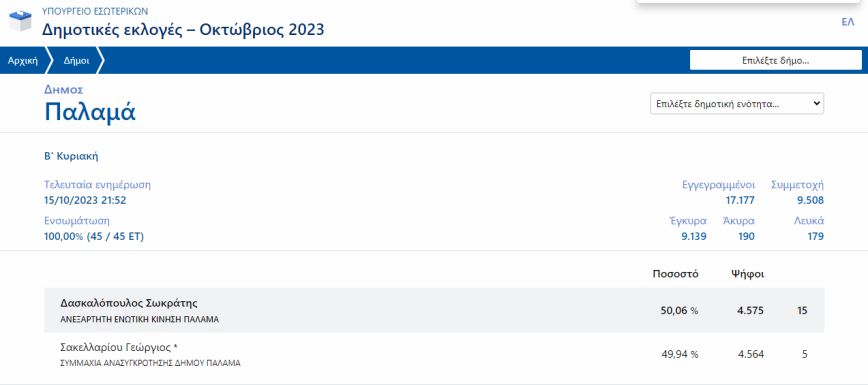 Σύμφωνα με τα επίσημα στοιχεία του Υπουργείο Εσωτερικών νικητής αναδείχθηκε την δεύτερη Κυριακή ο επιχειρηματίας Σωκράτης Δασκαλόπουλος, επικεφαλής του συνδυασμού «Ανεξάρτητη Ενωτική Κίνηση Παλαμά», λαμβάνοντας 50,06% και 4.575 ψήφους, έναντι 49,95% και 4.564 ψήφων του νυν δημάρχου και τοπογράφου μηχανικού στο επάγγελμα Γεώργιου Σακελλαρίου, επικεφαλής του συνδυασμού «Συμμαχία Ανασυγκρότησης Δήμου Παλαμά».