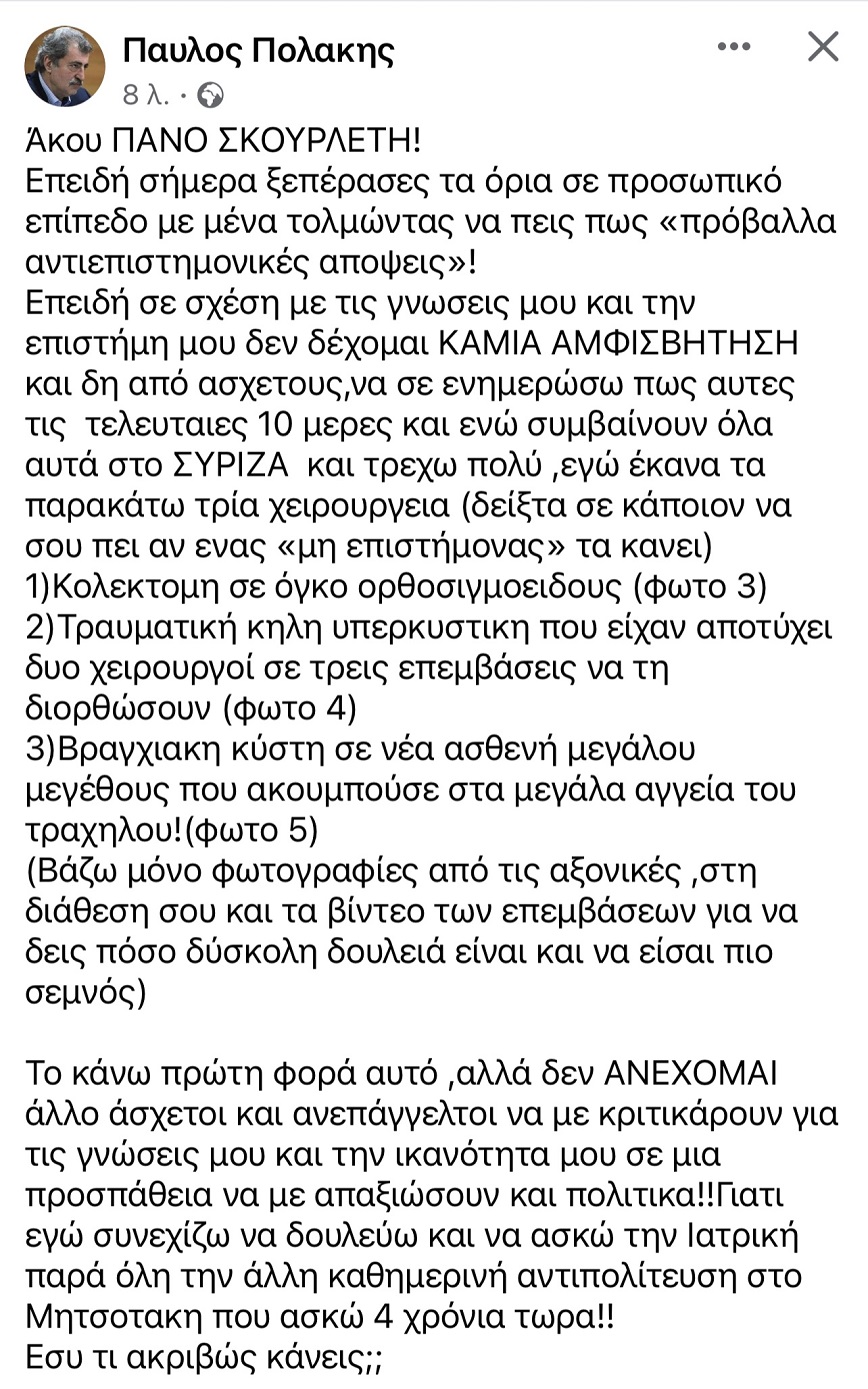 Ο Παύλος Πολάκης δεν άφησε αναπάντητα όσα είπε γι’ αυτόν ο Πάνος Σκουλέτης και τοποθετήθηκε μέσα από μία ανάρτηση που έκανε στο Facebook.