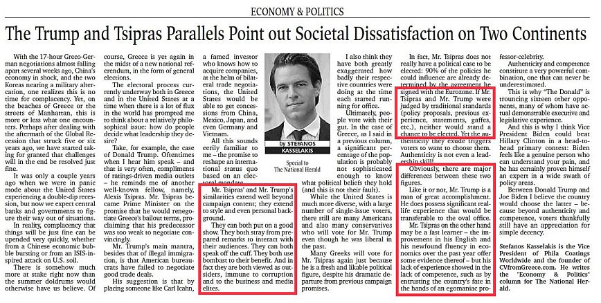 «Οι ομοιότητες του κ. Τσίπρα και του κ. Τραμπ επεκτείνονται πέρα από το περιεχόμενο της προεκλογικής εκστρατείας, στο στυλ αλλά και στο προσωπικό υπόβαθρο του καθενός. Και οι δύο μπορούν να στήσουν ένα καλό σόου. Και οι δύο παρεκκλίνουν από τις έτοιμες δηλώσεις τους για να αλληλεπιδράσουν με το ακροατήριό τους. Μπορούν και οι δύο να μιλούν αυθόρμητα. Και οι δύο χρησιμοποιούν βαρύγδουπες εκφράσεις προς όφελός τους. Και στην πραγματικότητα, αντιμετωπίζονται και οι δύο ως αουτσάιντερς, χωρίς να τους επηρεάζει η διαφθορά ούτε οι επιχειρηματικές και μιντιακές ελίτ».
