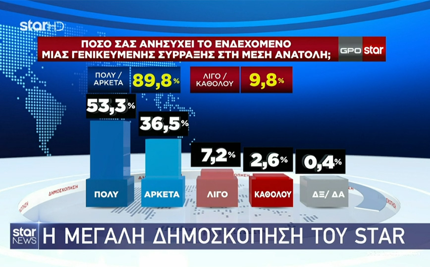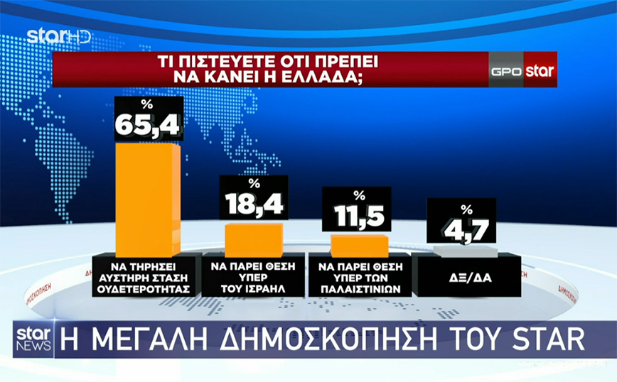 9 στους 10 ανησυχούν για τις εξελίξεις στη Μέση Ανατολή και για το ενδεχόμενο γενικής σύρραξης, ενώ σε ερώτηση για το τι πρέπει να κάνει η Ελλάδα το 65,4% να τηρήσει αυστηρή ουδετερότητα, το 18,4% να στηρίξει το Ισραήλ και 11,5% να στηρίξει την Παλαιστίνη.