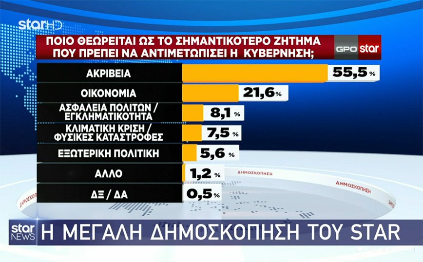 Σε ερώτηση για το ποιο είναι το σημαντικότερο ζήτημα για την κυβέρνηση το 55,5% απαντά η ακρίβεια, το 21,6% η οικονομία, ενώ 8,1% η εγκληματικότητα.