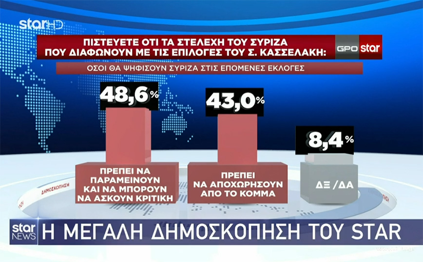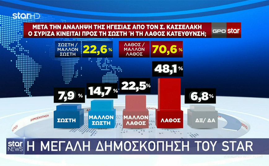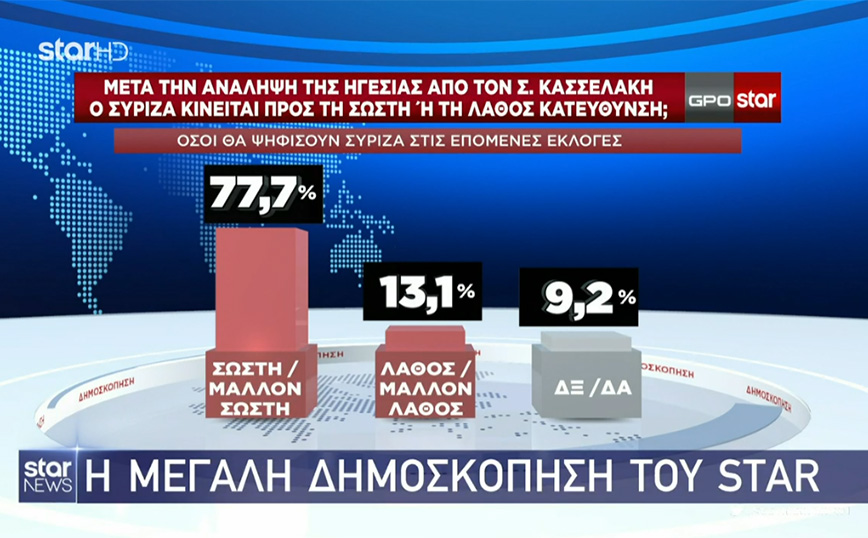 Όσον αφορά στις εξελίξεις στον ΣΥΡΙΖΑ, στην ερώτηση για το προς τα που κινείται ο ΣΥΡΙΖΑ με αρχηγό τον Κασσελάκη το 70,6% ψηφίζει πως πηγαίνει σε λάθος κατεύθυνση, ενώ το 22,6% στη σωστή κατεύθυνση.