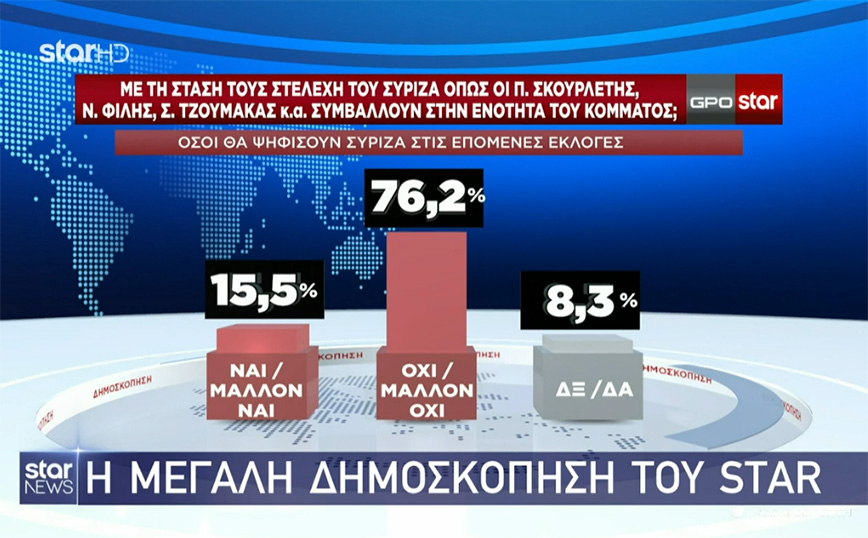 Όσον αφορά τις εξελίξεις με τις διαγραφές στον ΣΥΡΙΖΑ και το πώς αυτό συμβάλλει στην ενότητα του κόμματος, το 76,2% ψηφίζει όχι και μάλλον όχι, ενώ το 15,5% ναι και μάλλον ναι.