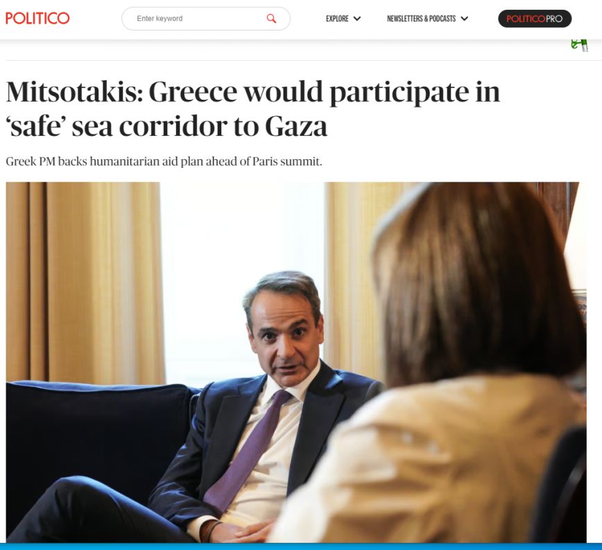 Η Ελλάδα θα εξετάσει το ενδεχόμενο να συμμετάσχει σε έναν θαλάσσιο διάδρομο ανθρωπιστικής βοήθειας προς τη Γάζα, εάν τα πλοία μπορούν να πλέουν σε καθεστώς «πλήρους προστασίας», δήλωσε ο πρωθυπουργός Κυριάκος Μητσοτάκης στο περιοδικό Politico. Η συνέντευξη στο podcast Power Play του Politico θα μεταδοθεί ολόκληρη την Πέμπτη.