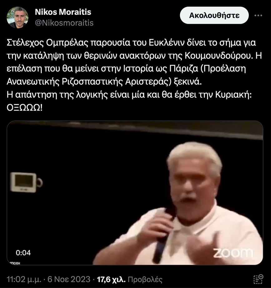 Η συγκεκριμένη τοποθέτηση πάντως, προκάλεσε την έντονη αντίδραση του στιχουργού Νίκου Μωραΐτη, που έχει στηρίξει την επιλογή Κασσελάκη για την προεδρία του κόμματος, ο οποίος σε δική του ανάρτηση στο X, σχολίασε: «Στέλεχος Ομπρέλας παρουσία του Ευκλένιν (σ.σ. εννοεί τον Τσακαλώτο) δίνει το σήμα για την κατάληψη των θερινών ανακτόρων της Κουμουνδούρου. Η επέλαση που θα μείνει στην Ιστορία ως Πάριζα (Προέλαση Ανανεωτικής Ριζοσπαστικής Αριστεράς) ξεκινά.