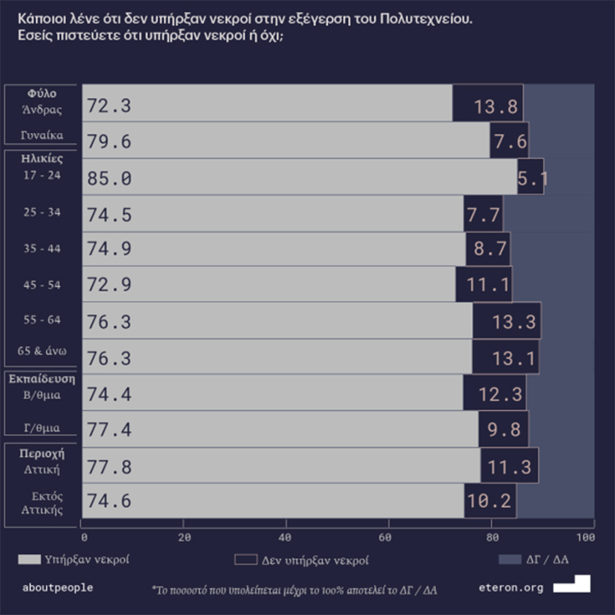 Νέα έρευνα που έγινε με αφορμή την επέτειο εξέγερσης του Πολυτεχνείου αποκαλύπτει πόσα άτομα στην Ελλάδα υιοθετούν το fake news που ξεκίνησε από κύκλους της ακροδεξιάς για την μη ύπαρξη νεκρών στο Πολυτεχνείο.